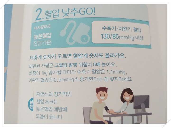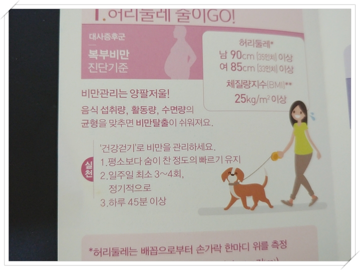 5가지 항목중에서 1~2가지에 해당되면 대사증후 주의군에 해당되며,관리하지 않으면 대사증후군으로 발전할수 있기에 조심해야 합니다.