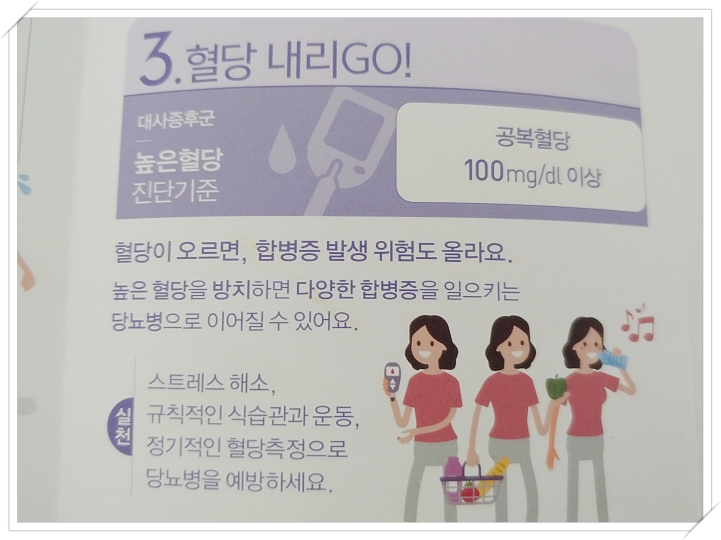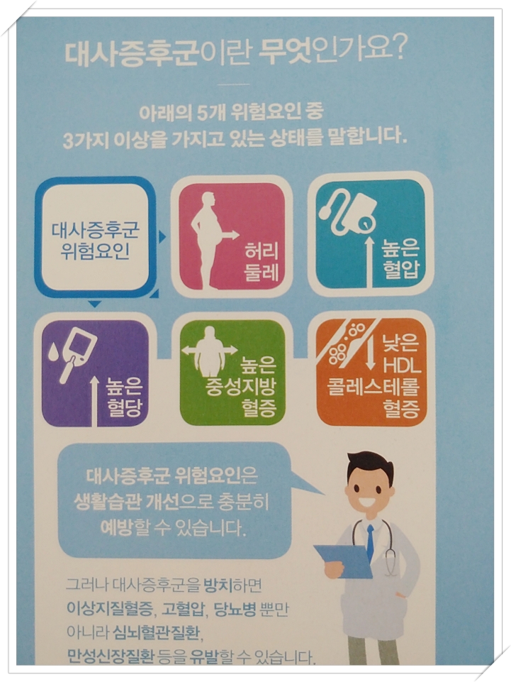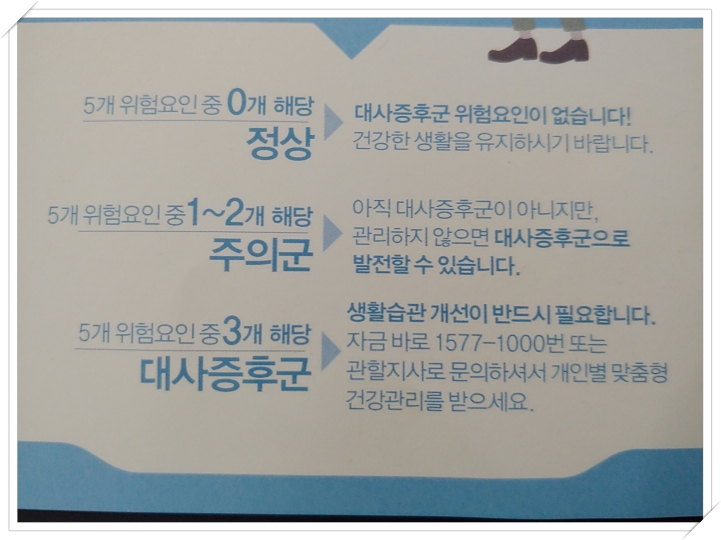 5가지 항목중에서 1~2가지에 해당되면 대사증후 주의군에 해당되며,관리하지 않으면 대사증후군으로 발전할수 있기에 조심해야 합니다.