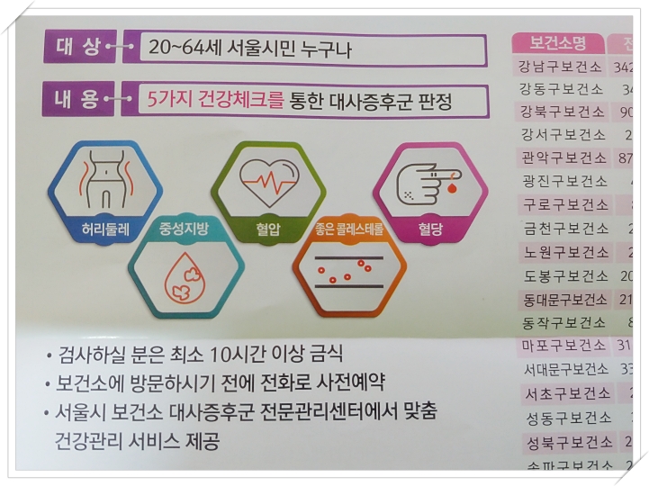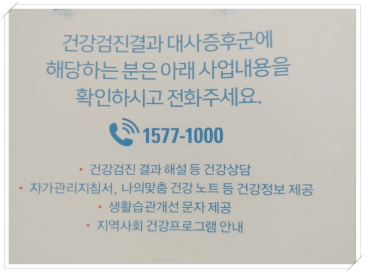건강검진 결과 대사증후군에 해당하거나 대사증후군 검사를 받고자 하는 시민 누구나 지역 센터에 연락을 하면 증후군 관리 및 서비스를 받을수 있다고 합니다.