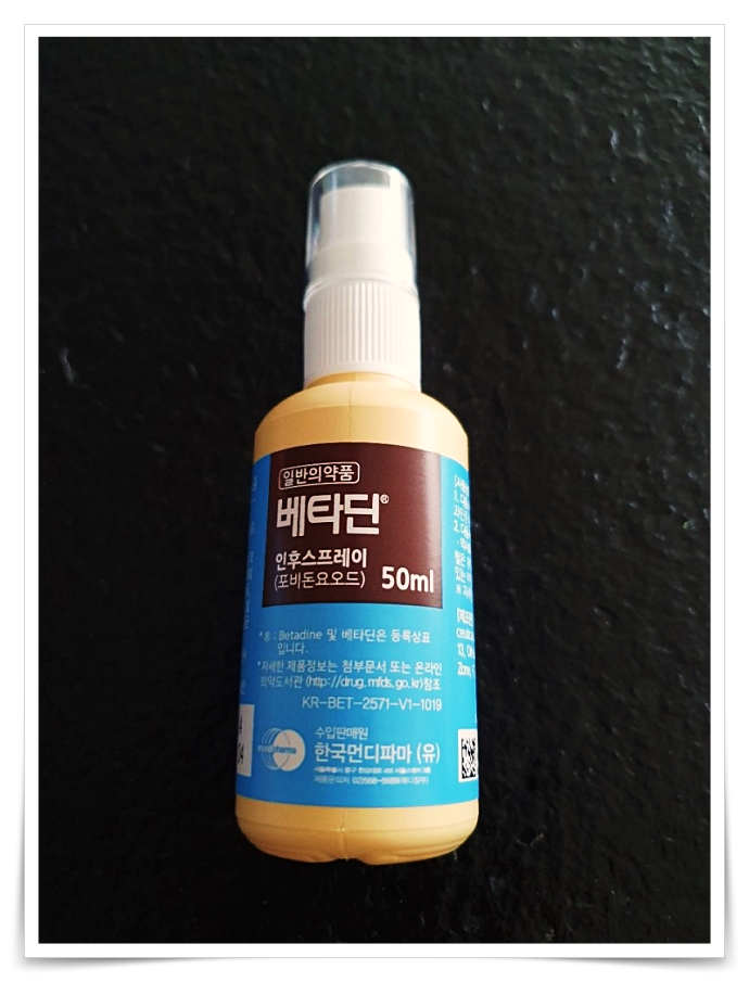 붉은 용액인 포비돈 요오도와 비교를 한다면 상처난 부위를 바른다면 베타딘은 입속에 스프레이 성격으로 뿌린다고 보면 되겠습니다.