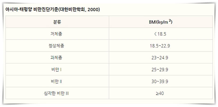 다만 체질량지수(BMI)를 너무 맹신하지는 마시고, 비만에 해당되지 않더라도, 정교한 체성분 분석기를 통해서 신체 내부의 체성분에 따라서 마른 비만이 될 수도 있고,뚱뚱한 근육형이 될수도 있습니다.도표상으로 BMI 수치가 23kg/m2이상이면 과체중과 비만이고,40이상이면 심각한 비만이라고 합니다.어느정도 나올지는 개인들이 쉽게 계산할수 있습니다.