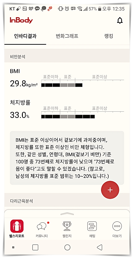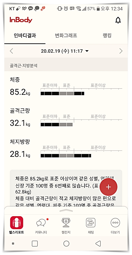자료 값은 제 나이와 신장(키) 기준해서 표준체중에 비해 무게는 100명 중에서 6번째로 높으며, 체중 대비 골근 격량이 100명 기준 81번째로 적다고 나오네요.;;체지방률(%)은 남성의 표준 범위는 10%~20%사이므로, 범위를 넘어섰으며, BMI 기준 100명 중 73번째로 체지방이 낮다고 결과가 나옵니다.