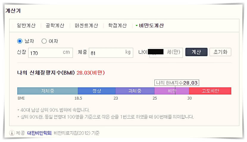 저 같은 경우 10년 동안 몸무게가 75KG~85KG를 오르락내리락하고 있는데, 최근에 금주 덕분으로 그나마 몸무게가 조금 줄었는데, 아직도 가야 할 길이 많습니다... 제 키와 몸무게를 네이버 계산기에 입력했더니, 역시 비만입니다.그나마 비만학회 자료에는 비만 등급을 두 개로 나누어 비만 1단계라는 게 약간 위안이 되지만, 건강을 위해서는 체중 감량은 기필코 해야 할 과제입니다.