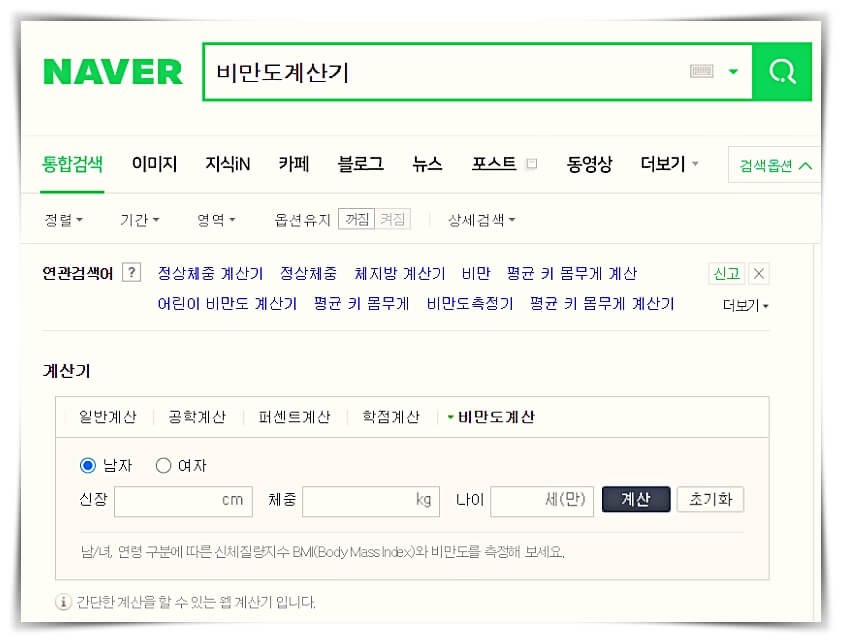네이버 초기화면에서 "비만도 계산기" 입력하면 비만도 계산하는 화면으로 바뀌고, 자기 키와 몸무게, 나이를 입력하고, 옆에 계산기 버튼을 눌리면 바로 체질량지수를 알 수가 있습니다. 자기 체중이 정상인지 과체중인지 가장 간단하게 알아볼 수 있는 도구입니다.