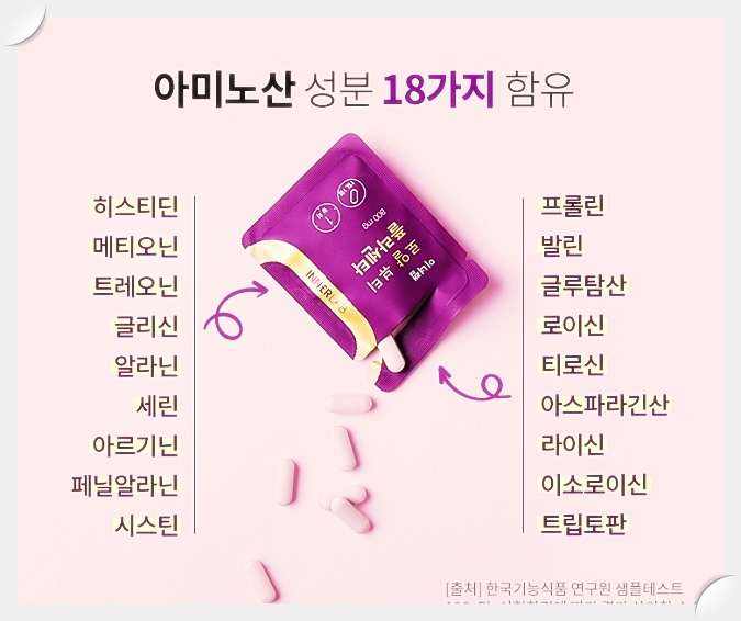 프롤린,발린,글루탐산,로이신,타로신,아스파라간산,라이신,이소로이신,트립토판,히스탄틴,메티오닌,트레오닌,글리신,알라닌,세린,아르기닌,페닐알라닌,시스틴등 18종으로 구성되어 있습니다.