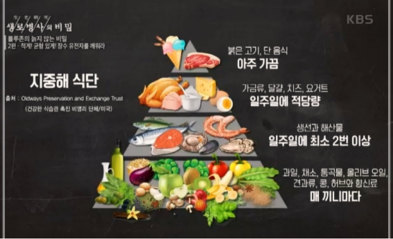 지중해식 식단이라고 하면 과일채소와 통곡물,올리브오일,건과류,콩 허브와 향신료등을 매 끼니마다 섭취해주고,싱싱한 생선과 해산물은 일주일에 최소 2번이상 먹어주고,달걀,가금류,치즈,요거트는 일주일에 적당량을 섭취하고,붉은 고기와 단 음식은 아주 가끔씩 먹어주는 식단이라고 합니다.