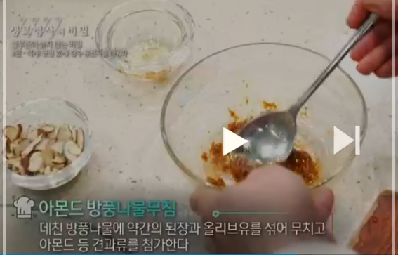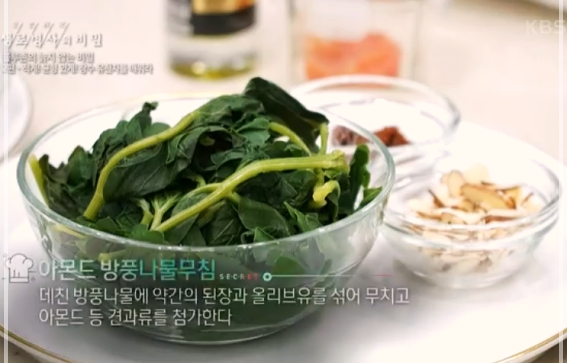 아몬드 방풍나물무침과 두부 명란젓 볶음,미나리 들깨감자전등으로 만들수 있는데요.
